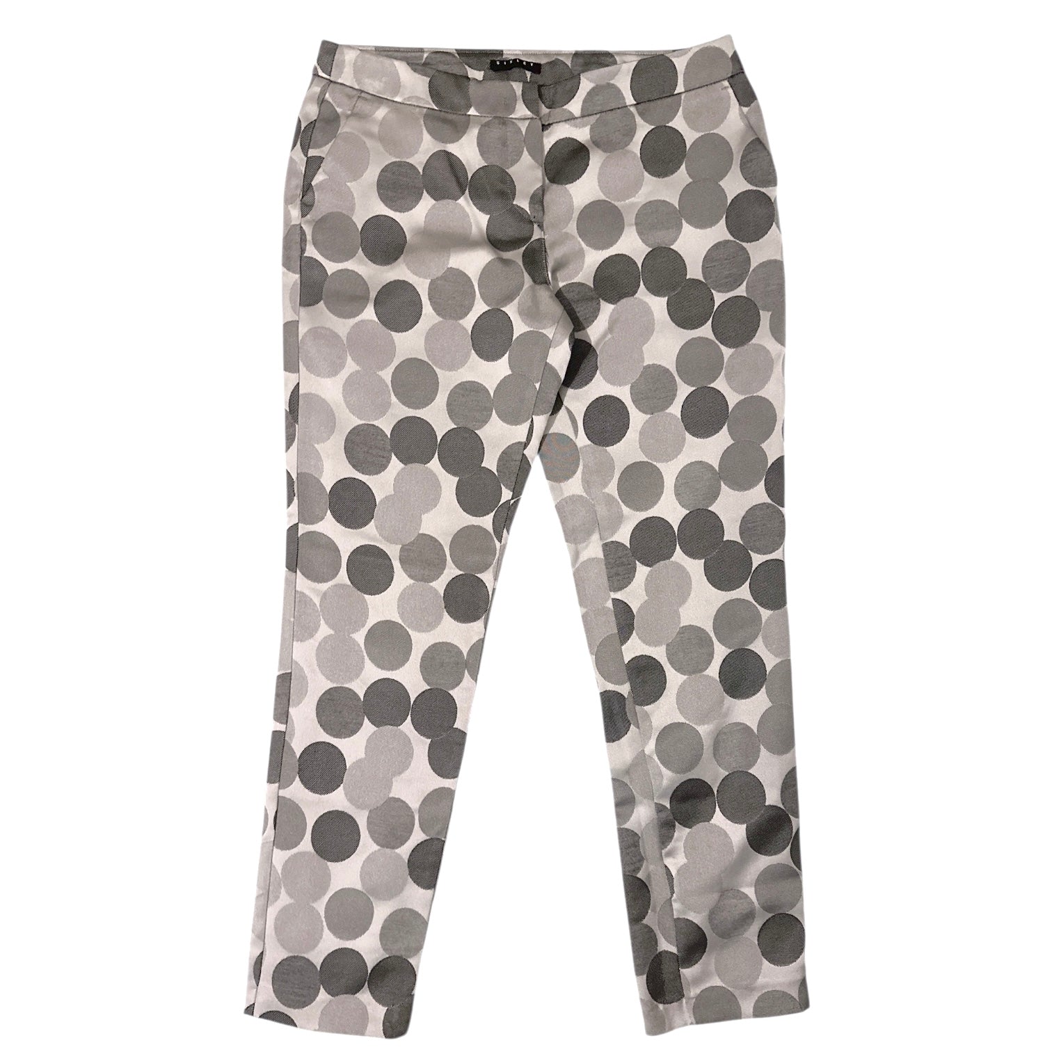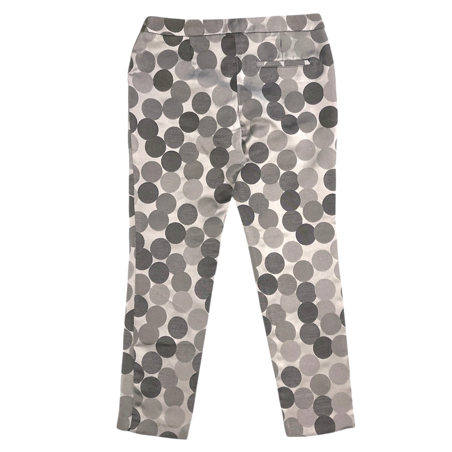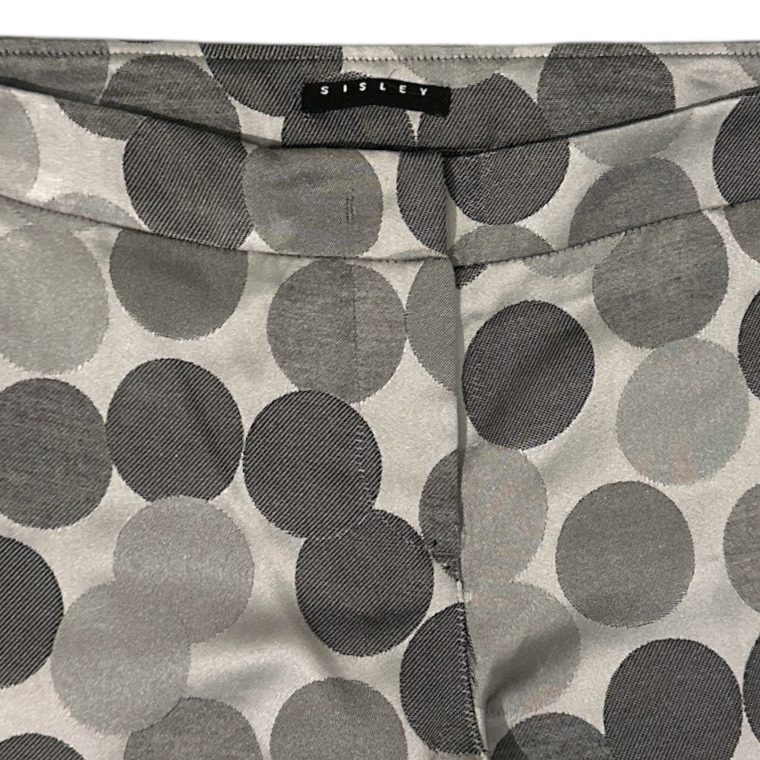PANTALÓN TOBILLERO DE TIRO BAJO DE LA RECONOCIDA MARCA ITALIANA SISLEY. PRETINA, BOLSILLOS Y CORTE DE PIERNA FINA CON MOTIVO DE LUNARES EN TONOS GRISES.